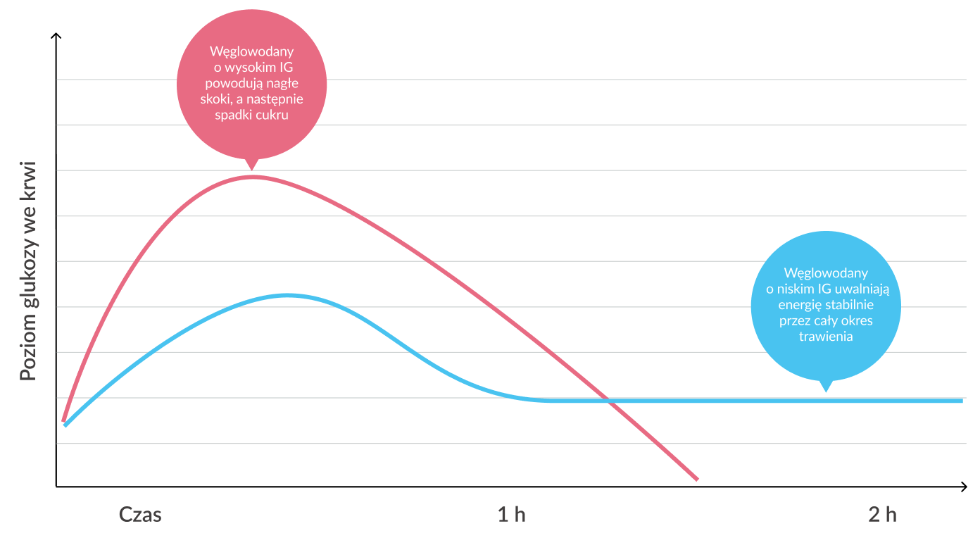 Indeks glikemiczny (IG) to miara, która pokazuje, jak zmienia się poziom glukozy we krwi w ciągu 2 godzin po spożyciu produktu. Produkty bogate w cukry proste mogą powodować gwałtowne skoki energii, po których pojawiają się senność i poczucie ociężenia.