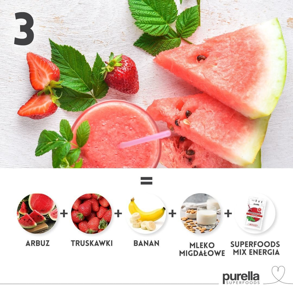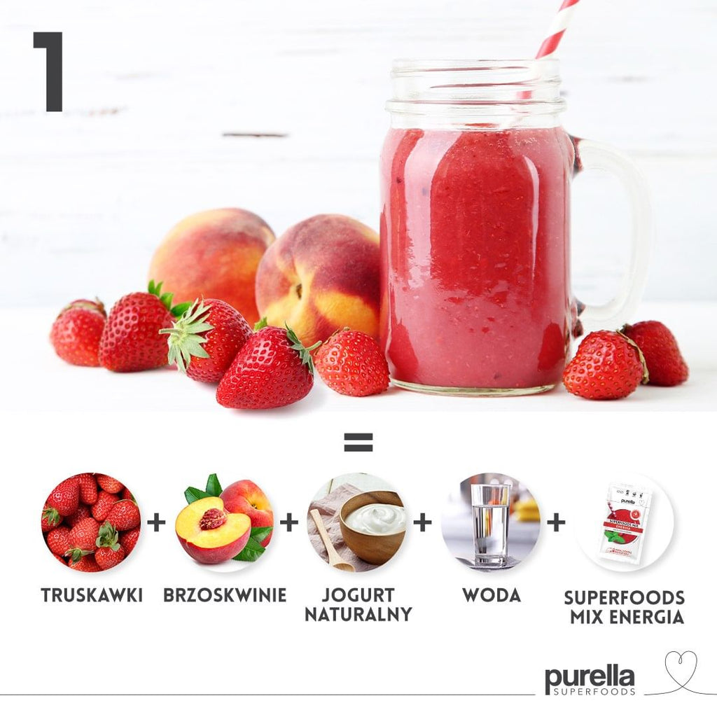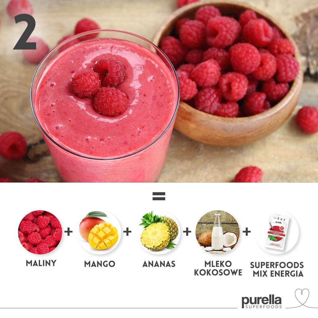 W kielichu blendera umieść banana, maliny ( świeże lub mrożone), truskawki, dodaj 1 łyżeczkę (5 g) Superfoods MIX Energia, uzupełnij wodą i zmiksuj. Jeżeli koktajl jest zbyt gęsty, dodaj więcej wody. Przelej do szklanki i gotowe! Wodę możesz zastąpić mlekiem lub ulubionym napojem roślinnym.
