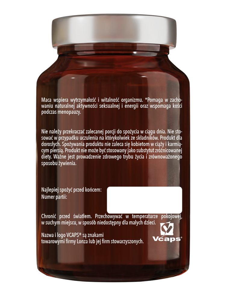 ekstrakt z korzenia macy; otoczka kapsułki Vcaps: hydroksypropylometyloceluloza.
